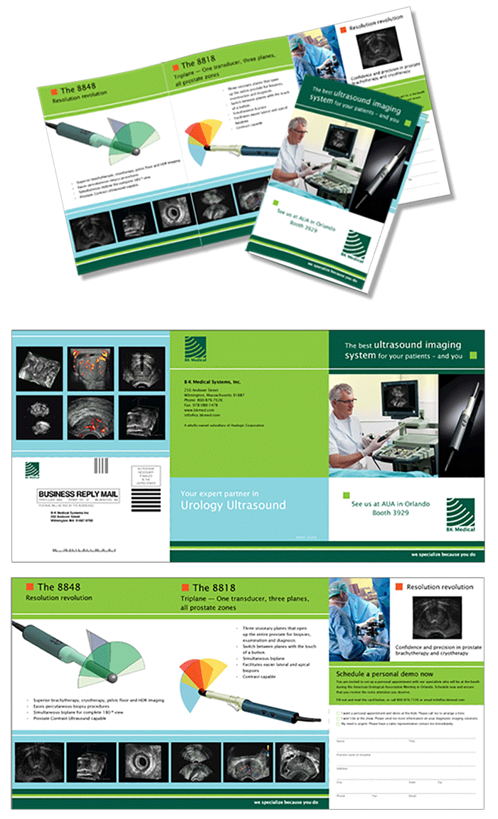 Eksempel på rullefalset lille brochure. 6 sider. BK Medical