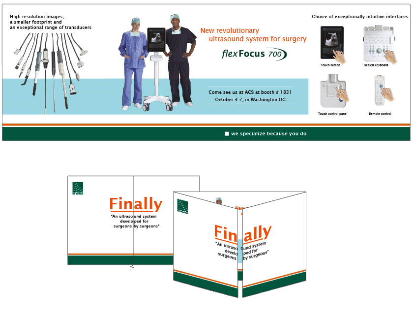 Eksempel på lille portfalset brochure. 4 sider. Invitation til messe. BK Medical